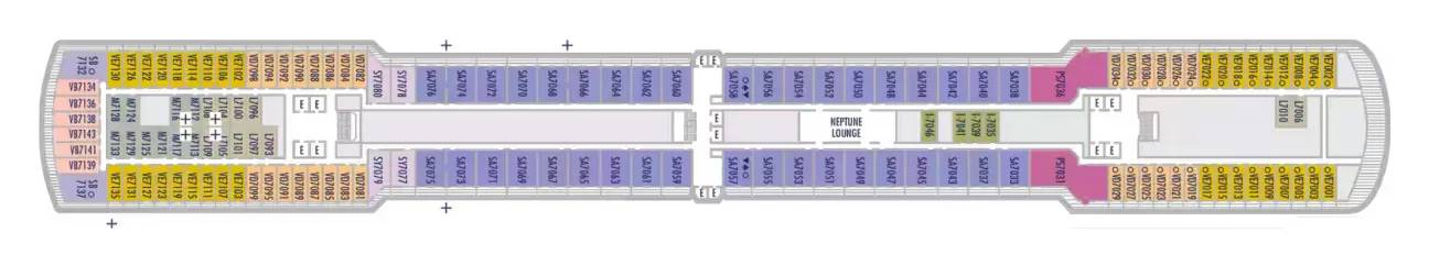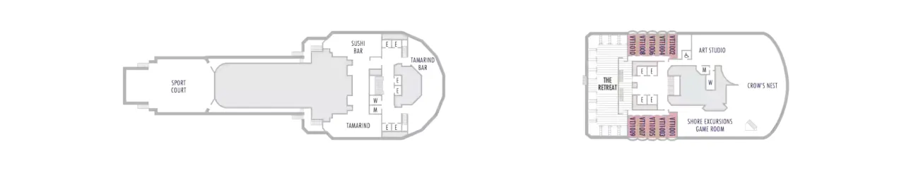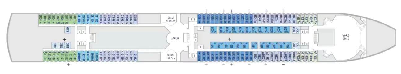 - Less ocean movement and proximity to Lower Promenade dining and entertainment.